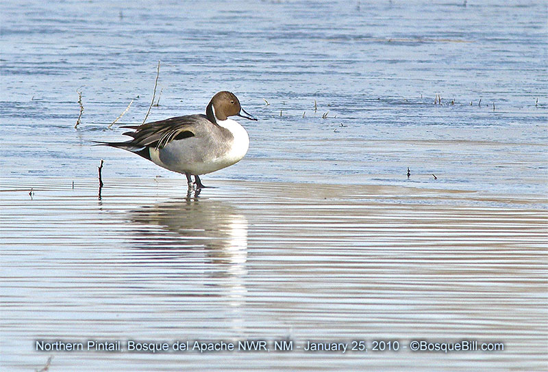 | Northern Pintail Pintail drake standing in an icy pond. Looks like there may be a band on his right leg. | |