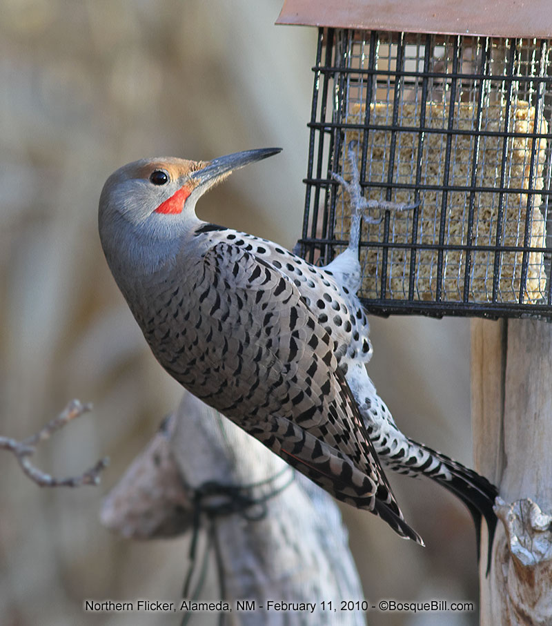 | Northern Flicker Once this fellow figured how to do it, he could consume vast amounts of peanut suet. Fortunately, he did this only for a few weeks in the dead of winter. | |