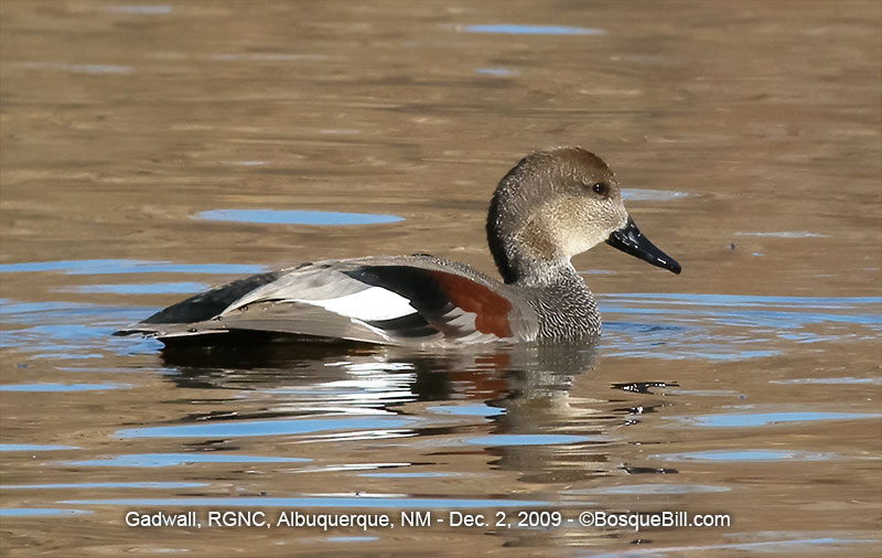 | Gadwall with racing stripes. You don't normally see that bright brown, black and white on the duck's side. Usually, they are much less colorful. | |