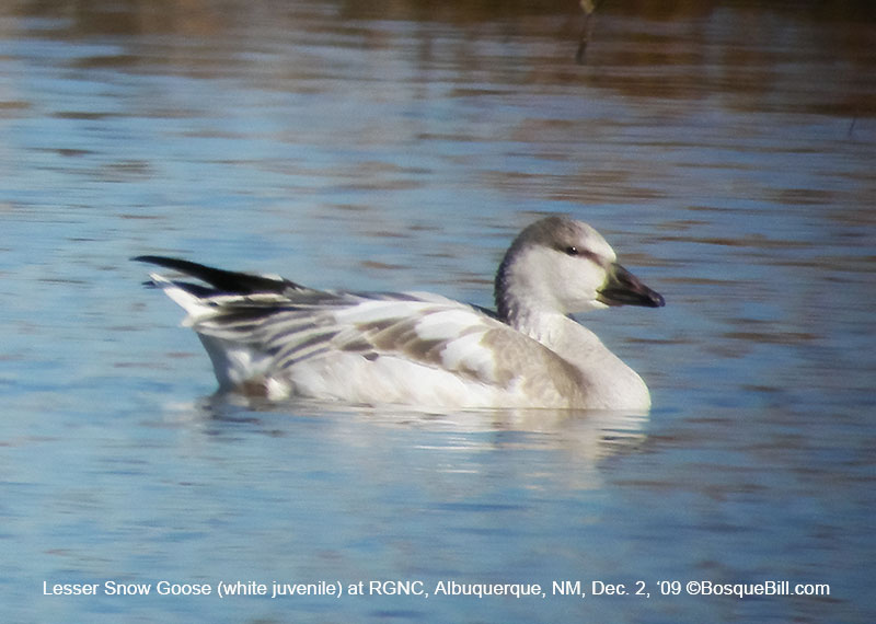 A white, juvenile Snow Goose. It was almost exactly the same size as the Cackling Geese all around it. Yes, this is a "white" juvenile that will mature to a lovely snowy white. The goose was about 325' away, which is why the image is not sharper.