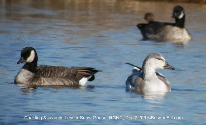 Snow Geese are usually about the same size as a Canada Goose. This one is about the same size as the smaller Cackling Goose. The Snow Goose has a more wedge-shaped head than a Ross' Goose and the border of the bill is curved, which is why this one ha