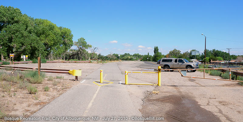 Small parking area at the end of Tingley Drive and bosque access. Note: from this point to Alameda the pavement has been replaced and is very smooth. Update: just noticed this photo needs replacing as the trail has be realigned at this point to circle around the parking area, thus keeping the trail separate from the parking lot.