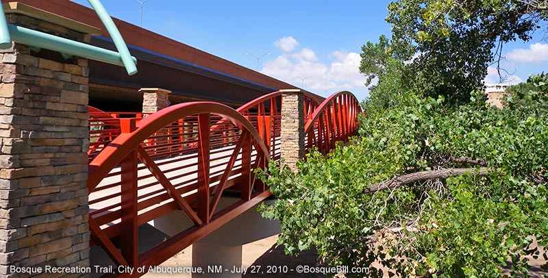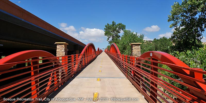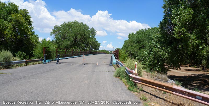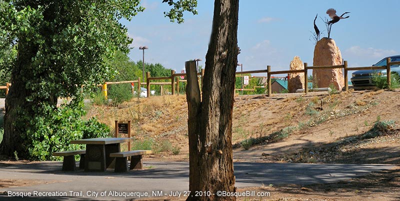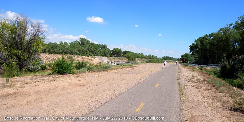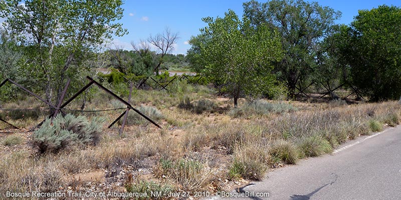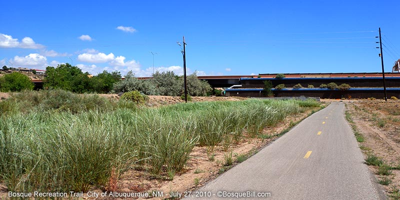 This is the entrance to the bike trail at Rio Bravo Blvd. If you are driving to here, take the frontage road at the first traffic light east of the bridge, then park in the picnic area parking lot at the NE corner of the bridge.