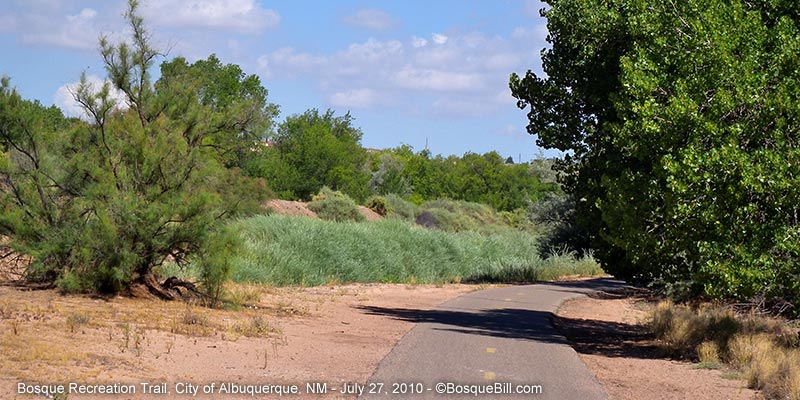 The Paseo del Bosque Bike Trail, also known as the Bosque Recreation Trail, was developed and is maintained by the City of Albuquerque, Bernalillo County, and the Middle Rio Grande Conservancy District (MRGCD.) The city has a web site for the trail. The trail is approximately 16 miles in length and is uninterrupted by roadways. This photo journey covers just under 14 of those miles.