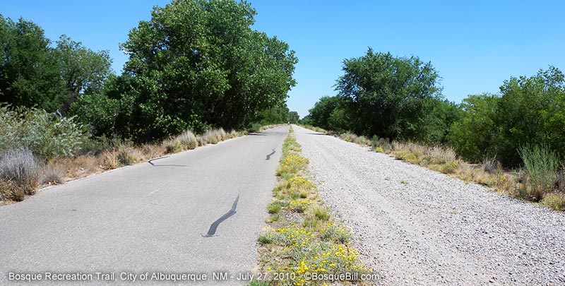 The Aldo Leopold Trail from RGNC (looking west.) The paved portion is suitable for bikes then it turns to sand which is difficult slogging. The foot trail goes north to almost Montaño Blvd.