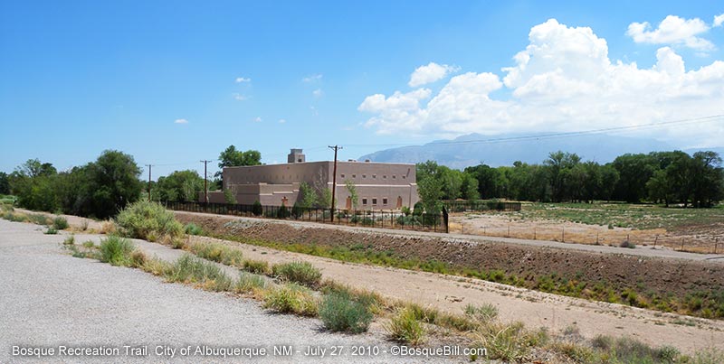 As you ride or walk along here you may wonder about this building. It is the water treatment plant for the San Juan-Chama Drinking Water Project. To the west of the trail is the water inlet on the river and an inflatable diversion dam to keep the water level high enough for the intakes.