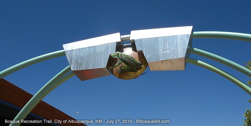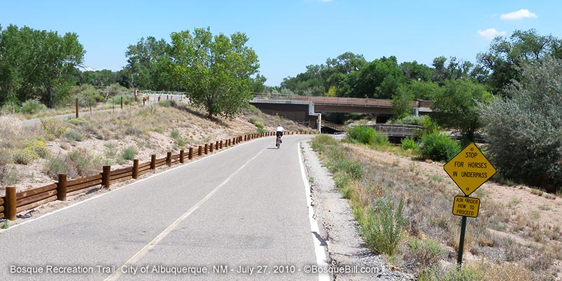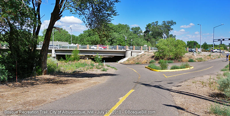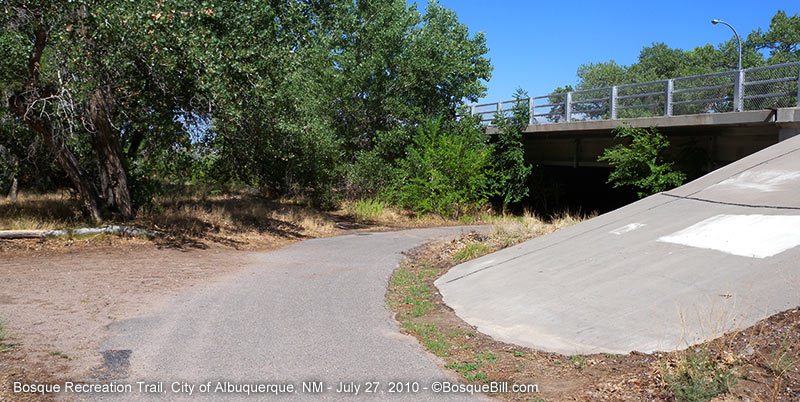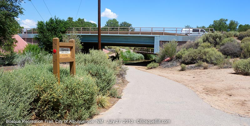 This is the entrance to the bike trail at Rio Bravo Blvd. If you are driving to here, take the frontage road at the first traffic light east of the bridge, then park in the picnic area parking lot at the NE corner of the bridge.