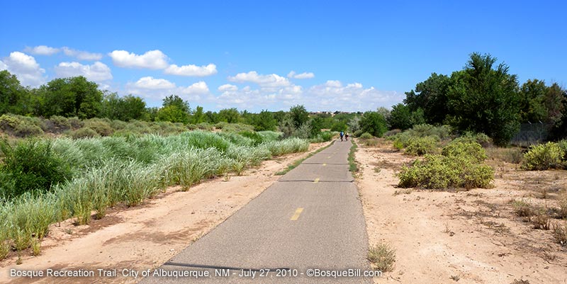 The Aldo Leopold Trail from RGNC (looking west.) The paved portion is suitable for bikes then it turns to sand which is difficult slogging. The foot trail goes north to almost Montaño Blvd.
