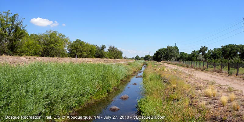 For those not familiar with our area, there are several types of man-made canals, most created and maintained by the MRGCD to both keep the land dry for development and to provide irrigation water to agricultural interests. Irrigation ditches are muddy and run at an elevation to gravity feed fields; drainage ditches are actually clear water below grade with frogs, muskrats, fish, turtles, cattails, dragonflies and other critters, they are not at all like sewers; lastly there are diversion ditches that distribute the water from the river to the irrigation ditches.