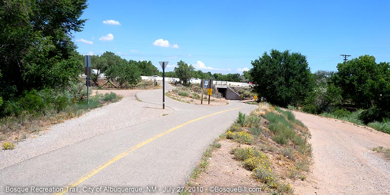 The trail passes under Bridge Blvd. To the left is a foot path south down through the bosque.