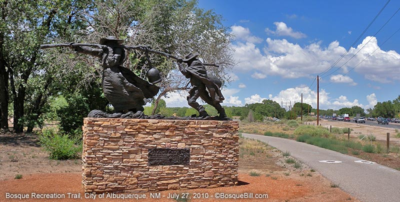 If you take the east fork of the trail just before the parking log you will arrive at the corner of Alameda Blvd. and Rio Grande Blvd. where you will find this bronze of "The Bell Keepers." The bronze sculpture was created by then Las Cruces based artist Bruce Papitto. It depicts a Spanish padre and a another man carrying a church bell to safety, after rescuing it from the washed away adobe church.